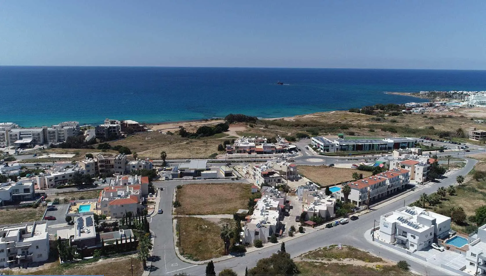 Villas and ground-floor apartments benefit from private gardens and patios, while upper-floor residences offer spacious balconies and verandas with sea views. Parking is conveniently located in three designated areas around the perimeter, ensuring the central gardens remain free from vehicle traffic. Approximately three-quarters of the development is dedicated to green spaces, walkways, and a central swimming pool area, complete with sun terraces and attractively landscaped surroundings—perfect for relaxation.